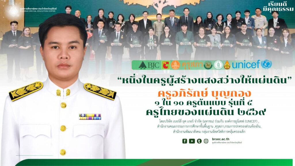 (เมื่อวันที่ ๙ มีนาคม ๒๕๖๙) นางสาวพันทิวา หทยาภิรมย์ ผู้อำนวยการศูนย์การศึกษาพิเศษ ประจำจังหวัดบุรีรัมย์ มอบหมายให้นายอภิรักษ์ บุญกองและนางสาววิชชาพร ศรสาลี ปฎิบัติราชการ ณ บริษัท เบอร์ลี่ ยุคเกอร์ จำกัด (มหาชน) ในการคัดเลือกรางวัล ๑ ใน ๑๐ ครูต้นแบบ รุ่นที่ ๕ โครงการ “ครูไทยของแผ่นดิน” ประจำปี ๒๕๖๙ ขอแสดงความภาคภูมิใจและชื่นชมยินดีกับ นายอภิรักษ์ บุญกอง ที่ได้รับการคัดเลือกให้เป็น ๑ ใน ๑๐ ครูต้นแบบ รุ่นที่ ๕ โครงการ “ครูไทยของแผ่นดิน” ประจำปี ๒๕๖๙ จากการนำเสนอผลงานด้านการจัดการเรียนรู้และการพัฒนานวัตกรรมทางการศึกษาที่สร้างประโยชน์ต่อ ผู้เรียนและสังคม รางวัลดังกล่าวเป็นการยกย่องครูผู้มีความมุ่งมั่น ทุ่มเท และอุทิศตนในการพัฒนาการศึกษา โดยเฉพาะการสร้างโอกาสทางการเรียนรู้ให้กับ ผู้เรียนอย่างแท้จริง ผ่านกระบวนการจัดการเรียนการสอนที่สร้างสรรค์และมีคุณค่า ซึ่งสะท้อนถึงบทบาทของครูผู้เป็นพลังสำคัญในการขับเคลื่อนการศึกษาของประเทศทั้งนี้ นายอภิรักษ์ บุญกอง ได้เข้าร่วมนำเสนอผลงานต่อคณะกรรมการผู้ทรงคุณวุฒิในเวทีระดับประเทศ เพื่อแลกเปลี่ยนองค์ความรู้และประสบการณ์ในการพัฒนาการศึกษา ร่วมกับครูต้นแบบจากทั่วประเทศ ความสำเร็จครั้งนี้นับเป็นอีกหนึ่งความภาคภูมิใจของสถานศึกษา ที่สะท้อนถึงศักยภาพของครูผู้มีจิตวิญญาณความเป็นครู มุ่งมั่นสร้างโอกาสและพัฒนาคุณภาพชีวิตของผู้เรียนให้เติบโตอย่างมีคุณค่าในสังคม ศูนย์การศึกษาพิเศษ ประจำจังหวัดบุรีรัมย์ ขอร่วมแสดงความชื่นชมและยินดีกับความสำเร็จอันทรงเกียรติในครั้งนี้ ซึ่งนับเป็นแบบอย่างที่ดีของครูผู้ทุ่มเทเพื่อการศึกษาของชาติ