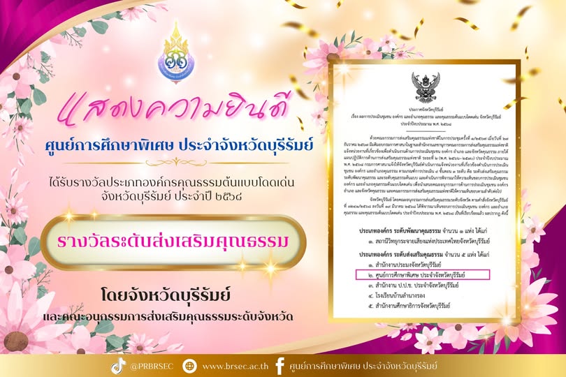 ได้รับรางวัลประเภทองค์กรคุณธรรมต้นแบบโดดเด่น จังหวัดบุรีรัมย์ ประจำปี ๒๕๖๘ 💛
