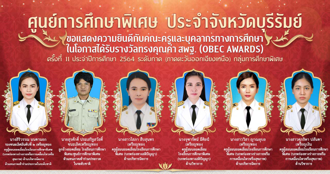 ศูนย์การศึกษาพิเศษ ประจำจังหวัดบุรีรัมย์ ขอแสดงความยินดีกับคณะครูและบุคลากรศูนย์การศึกษาพิเศษ ประจำจังหวัดบุรีรัมย์ ในโอกาสได้รับรางวัลทรงคุณค่า สพฐ. (OBEC AWARDS) ครั้งที่ 11 ประจำปีการศึกษา 2564 ระดับภาค (ภาคตะวันออกเฉียงเหนือ) กลุ่มการศึกษาพิเศษ ได้แก่