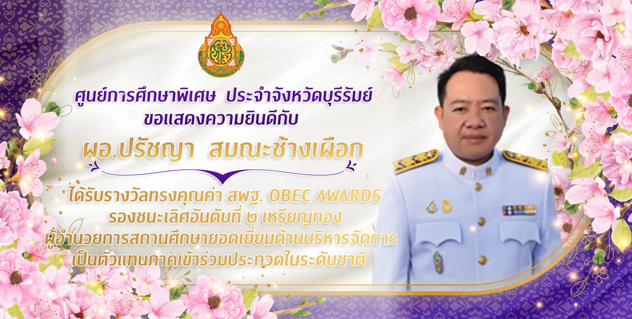 ศูนย์การศึกษาพิเศษ ประจำจังหวัดบุรีรัมย์ ขอแสดงความยินดีกับ นายปรัชญา สมณะช้างเผือก ผู้อำนวยการศูนย์การศึกษาพิเศษ ประจำจังหวัดบุรีรัมย์ ในโอกาสได้รับรางวัลทรงคุณค่า สพฐ. (OBEC AWARDS) ครั้งที่ 11 ประจำปีการศึกษา 2564 ระดับภาค (ภาคตะวันออกเฉียงเหนือ) กลุ่มการศึกษาพิเศษ รางวัลรองชนะเลิศอันดับที่ ๒ เหรียญทอง ประเภท ผู้อำนวยการสถานศึกษายอดเยี่ยมด้านบริหารจัดการและได้เป็นตัวแทนภาคเข้าร่วมประกวดในระดับชาติต่อไป