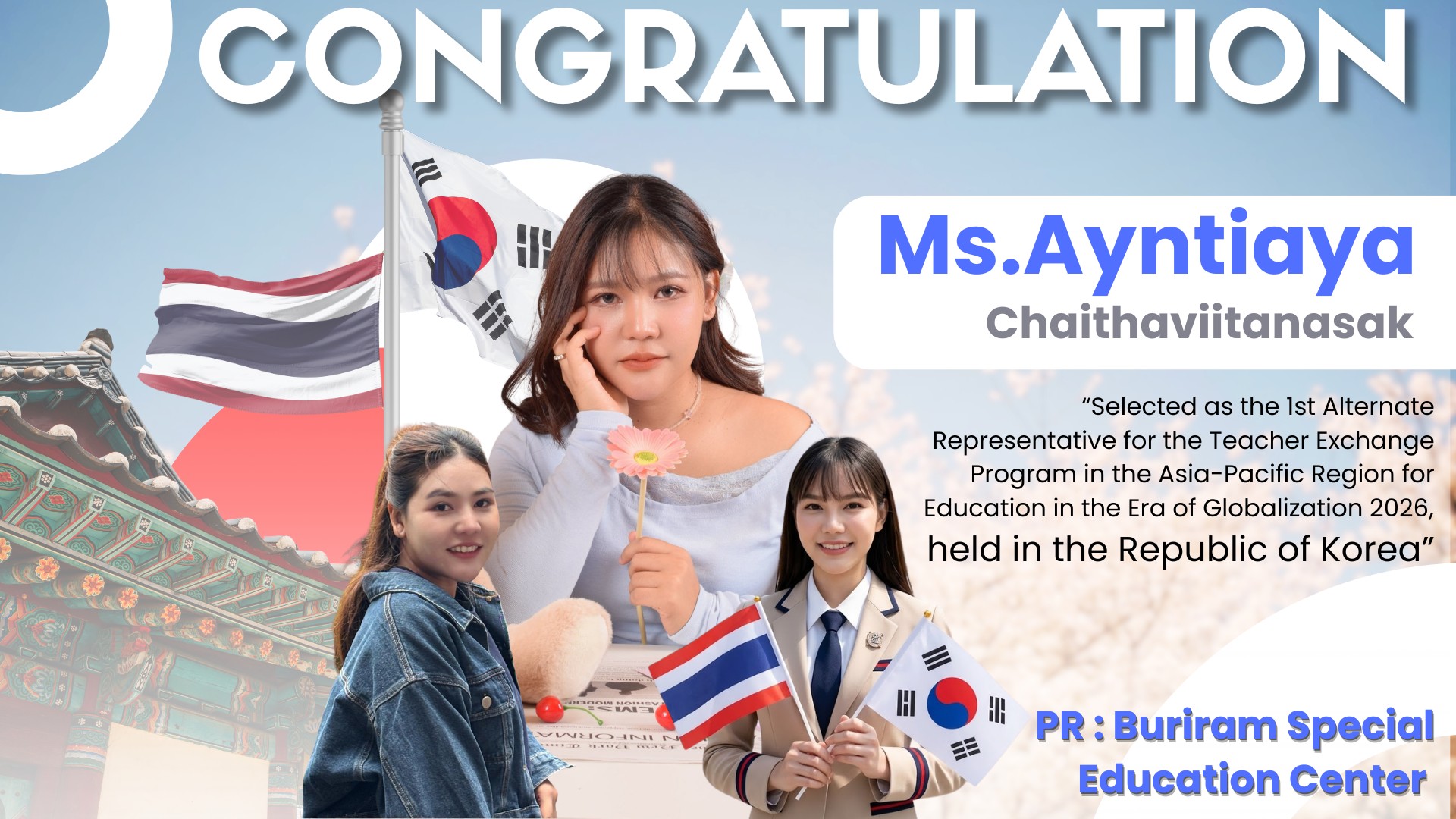 “Congratulations to Ms. Ayntiaya Chaithaviitanasak from Buriram Special Education Center on being selected as the 1st Alternate Representative for the Teacher Exchange Program in the Asia-Pacific Region for Education in the Era of Globalization 2026, held in the Republic of Korea.”